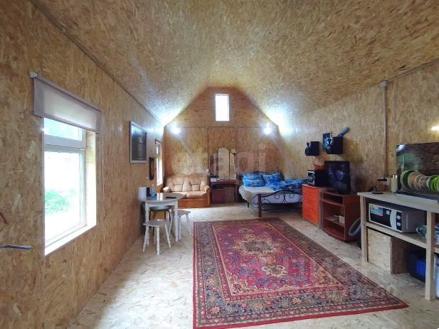 Дом площадью 46,1 м² расположен в живописном районе в 29 км от объездной дороги, рядом с рынком "Дачный Сот Березка" треста "Моргидрострой". Участок 5,5 соток граничит с лесным массивом, что обеспечивает уединенность и тишину, а близость реки с укрепленным берегом добавляет природной привлекательности. Дом построен на ленточном бутобетонном фундаменте, стены из бетонных блоков (2040 см) утеплены пенополистиролом и обшиты ОСБ. Внешняя отделка сочетает дерево и цементные плитки ручной работы, что придает фасаду индивидуальность. Все окна пластиковые, обеспечивающие тепло- и звукоизоляцию.