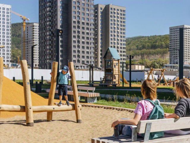 Проектом предусмотрено строительство 8 жилых корпусов разной этажности, внутри которых обустроен приватный двор-парк. Его концепция включает в себя ландшафтный дизайн и озеленение: на приватной территории у дома высажены деревья, разбиты газоны, обустроены детские и спортивные площадки с учетом нейродинамического подхода и с акцентом на развитии вестибулярной системы, сенсорной моторики, ловкости и интеллекта.
