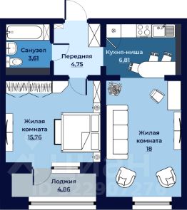Квартира свободной планировки, 51,73 м²