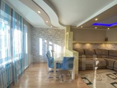 Особого внимания заслуживает система освещения в квартире. Многоуровневая подсветка используется для зонирования пространства и подчеркивает важные элементы дизайна, создавая особую атмосферу уюта.