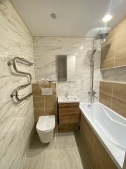 В санузле выполнен свежий ремонт с использованием современных и качественных материалов. Стены облицованы керамогранитом, установлена система теплый пол.