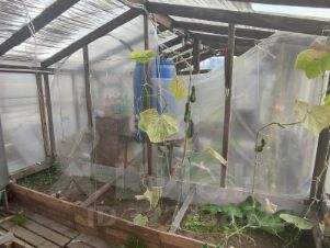 Плодовые деревья (яблони, вишни), грядки с клубникой, две теплицы.