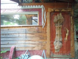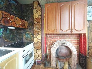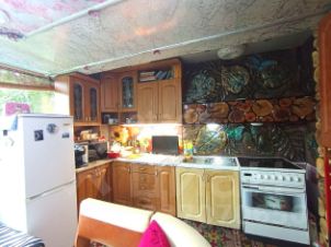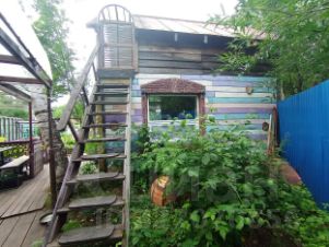 Дом двухэтажный: на первом этаже расположена просторная веранда-прихожая, кухня-гостиная спальня и туалет. Второй этаж занимает еще одна спальня с большим открытым балконом, доступ на который организован через уличную лестницу. Отопление комбинированное: водяные радиаторы работают от дровяной печи или электричества, что позволяет поддерживать комфортную температуру в любое время года. Вода подается из собственной скважины (летний вариант, без утепления). Канализация автономная три выгребные ямы обслуживают дом, баню и туалет. Туалет находится в доме и на улице.