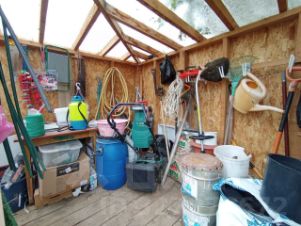 На территории расположен летний одноэтажный дом площадью 24 м² с печным отоплением. Несмотря на компактные размеры, помещение хорошо сохраняет тепло и обеспечивает комфортное пребывание. Электричество подключено круглогодично, вода доступна в летний сезон. Для хранения инвентаря предусмотрена хозяйственная постройка, туалет расположен на улице и содержится в чистоте.
