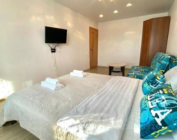 В апартаментах возможно размещение 3 человек. Спальные места: двуспальная кровать, раскладной диван. Кухня оборудована необходимой посудой и техникой: электрическая плита, холодильник, чайник, микроволновка. К услугам гостей также Wi-F, телевизор, стиральная машина, постельное белье, полотенца, фен, утюг с гладильной доской, сушилка для одежды, гигиенические принадлежности.